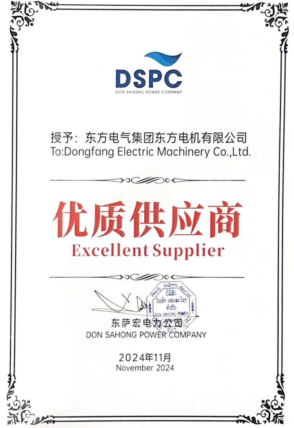 东萨宏电力公司向东方电机揭晓的“优质供应商”证书,,,,,是对机组运行优异的最好证实。。。。。