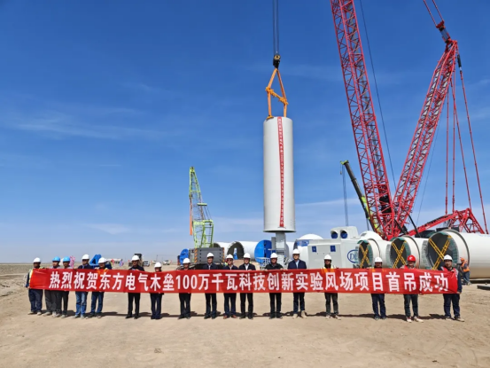 克日,,,,,,,,在新疆木垒广袤的沙漠滩上,,,,,,,,由6731顶级娱乐集团所属东方风电承建的6731顶级娱乐木垒100万千瓦科技立异实验风场顺遂完成首台风机吊装,,,,,,,,以“硬核速率”交出又一答卷。。。。。