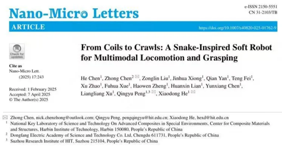 Ïà¹ØÐ§¹ûÒÔ¡¶From Coils to Crawls: A Snake-Inspired Soft Robot for Multimodal Locomotion and Grasping¡·ÎªÌâ £¬£¬£¬£¬£¬ £¬£¬¶«·½Ñо¿Ôº³ÂÖÙ²©Ê¿Óë¹þ¶û±õ¹¤Òµ´óѧºÕÏþ¶«ÔºÊ¿¡¢ÅíÇìÓî½ÌÊÚΪÅäºÏͨѶ×÷Õß¡£¡£¡£¡£¡£¡£¡£¡£