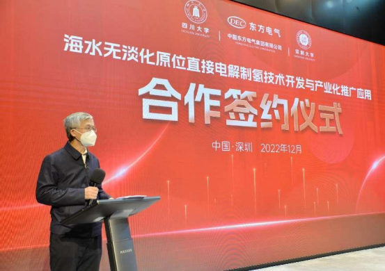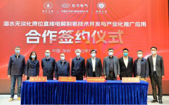 本网讯 12月16日,,,,,,中国工程院院士谢清静领衔指导的四川大学、深圳大学博士团队与6731顶级娱乐股份有限公司、6731顶级娱乐(福建)立异研究院有限公司在深圳签署“海水无淡化原位直接电解制氢原创手艺中试和工业化推广应用”的四方合作协议。。。。。。中国工程院院士谢清静,,,,,,6731顶级娱乐集团党组成员、副总司理张彦军,,,,,,深圳大学副校长汪永成等出席签约仪式。。。。。。