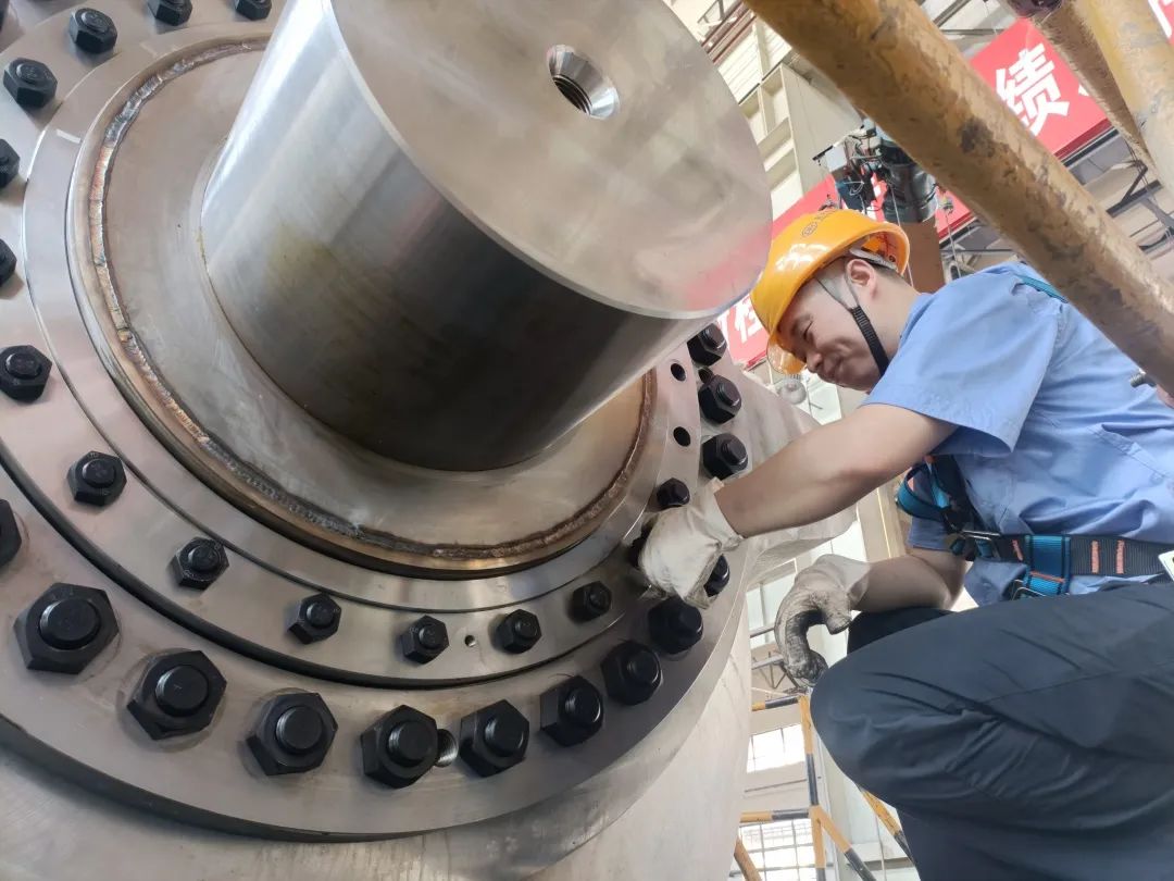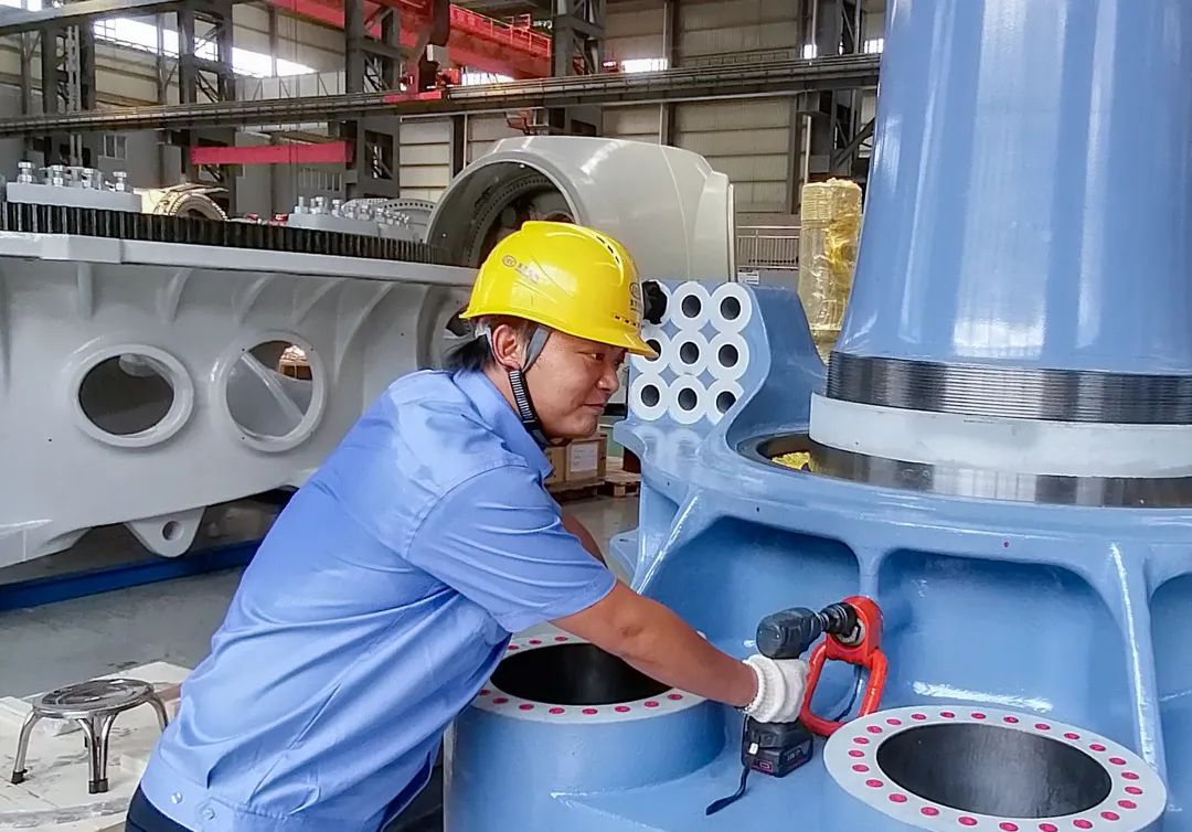 ◆东方电机水轮机分厂内,,,,,,,蟠龙3号机球阀轴规则在举行装配作业
