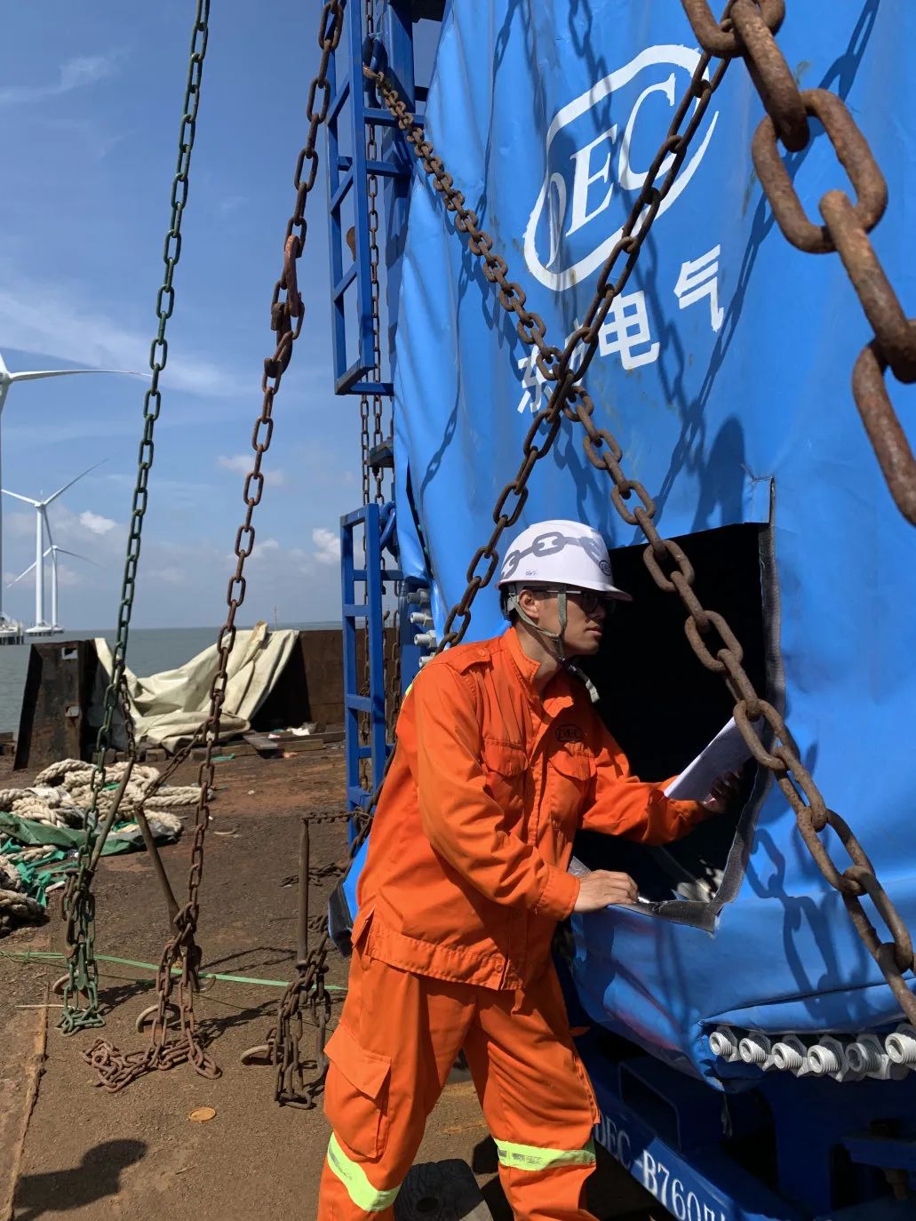 ◆东方国际职工正在核对越南长海3期海优势电项目相关数据,,,,,,,协调风机吊装事情