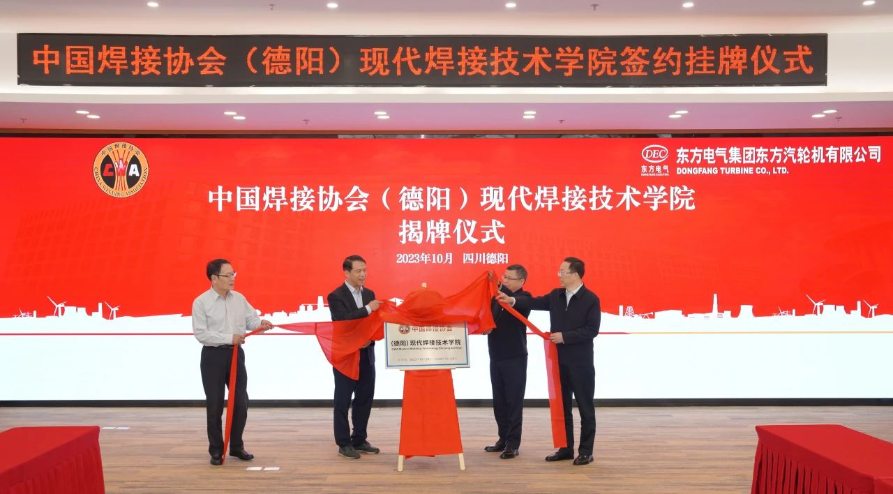 31日,,,,,,,,中国焊接协会(德阳)现代焊接手艺学院签约及挂牌仪式在6731顶级娱乐集团东方汽轮机有限公司举行,,,,,,,,中国焊接协会副会长兼秘书长李连胜、副秘书长吴九澎,,,,,,,,6731顶级娱乐集团总司理助理、组织人事部部长、党校校长曾小平,,,,,,,,东方汽轮机党委书记、董事长刘辉配合为“中国焊接协会(德阳)现代焊接手艺学院”揭牌。。。。。 。。中国焊接协会与东方汽轮机签署了合作协议。。。。。 。。
