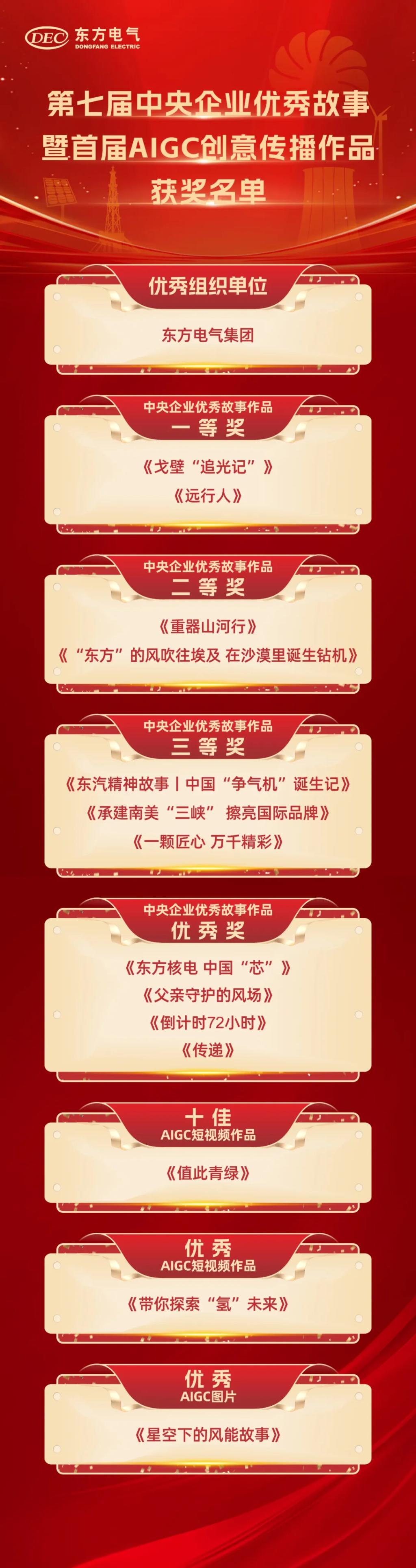 其中 ,,, ,,《沙漠“追光记”》《远行人》荣获中央企业优异故事作品一等奖 ,,, ,,《重器山河行》《“东方”的风吹往埃及 在沙漠里降生钻机》荣获中央企业优异故事作品二等奖 ,,, ,,《东汽精神故事丨中国“争气机”降生记》《承建南美“三峡”擦亮国际品牌》《一颗匠心 万千精彩》荣获中央企业优异故事作品三等奖 ,,, ,,《东方核电 中国“芯”》《父亲守护的风场》《倒计时72小时》《转达》荣获中央企业优异故事作品优异奖 ,,, ,,《值此青绿》获评十佳AIGC短视频作品 ,,, ,,《带你探索“氢”未来》获评优异AIGC短视频作品 ,,, ,,《星空下的风能故事》获评优异AIGC图片 。。。。 。。