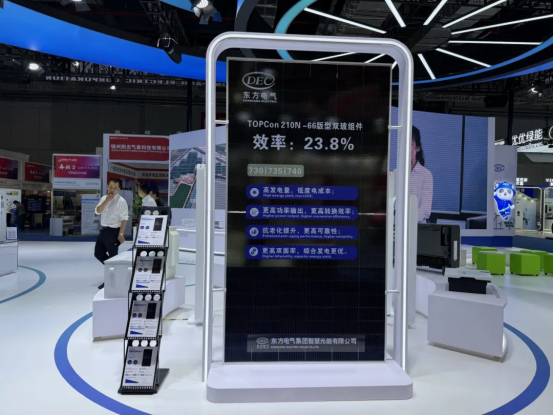 东方光能光伏组件系列产品,,,,,,适用于漫衍式、地面电站、海上光伏等多应用场景,,,,,,本次参展的DEC自主品牌TOPCon 210N-66版型半片双玻光伏组件,,,,,,接纳N型TOPCon电池手艺,,,,,,发电功率最高达740瓦,,,,,,转换效率抵达23.8%,,,,,,电池手艺和制造工艺位列行业前线,,,,,,具有高发电量、低度电本钱、高转化效率、高可靠性、优异的抗衰减能力、综合发电更优等特点。。。。。。